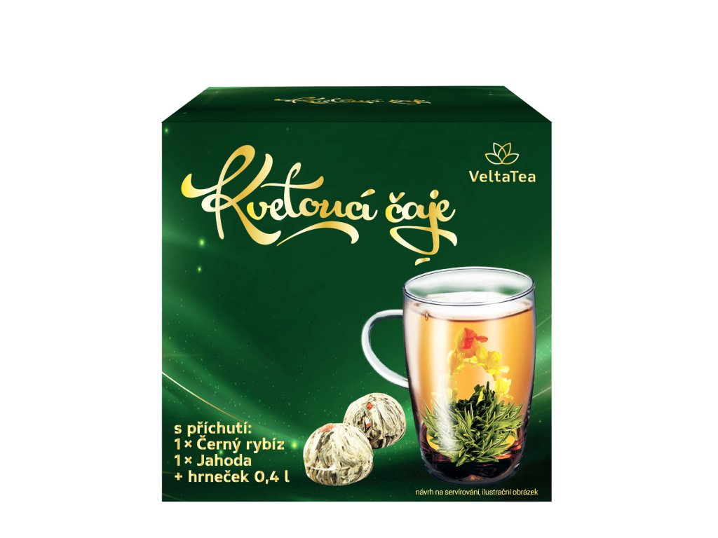 - Dárková kazeta se skleněným hrnkem (400ml) a zelené čaje aromatizované s květinou.